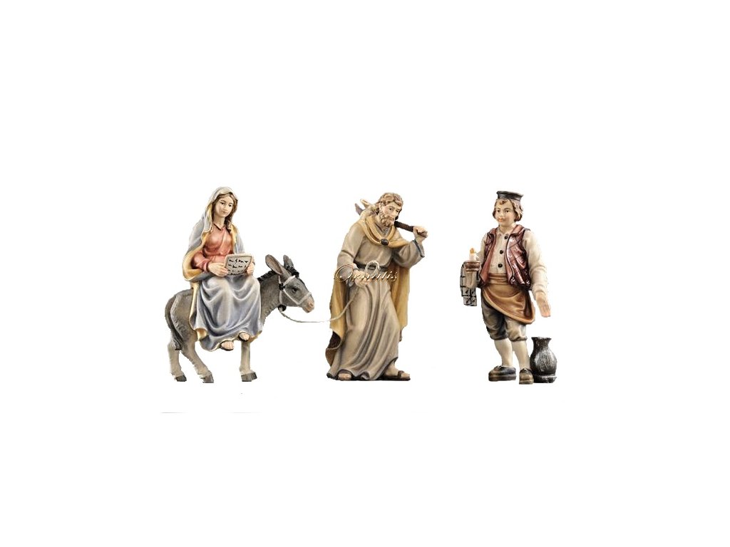 Drewniany rzeźbiony wizerunek ciężarnej Dziewicy Maryi i Józefa w drodze do Betlejem. Po tym, jak cesarz ogłosił spis ludności, Józef i jego ciężarna Maria udali się do rodzinnego miasta Judei, miasta Dawida, aby zarejestrować się u Marii. Kiedy przybyła do Betlejem, Maria urodziła syna. Żaden z mieszkańców nie chciał jednak zapewnić im dachu nad głową. Josef, który znał okolice miasta, wprowadził Marię do jaskiniowego schroniska dla zwierząt, które przystosował do narodzin dziecka. Statuetki są rzeźbione z drewna klonowego i malowane ręcznie farbami olejnymi. Statuetka przeznaczona jest do wnętrz.