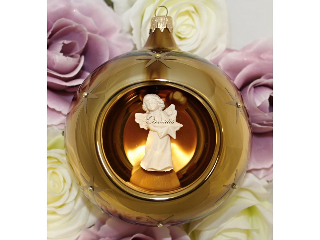 Szklany dmuchany ręcznie malowany ornament w kształcie kuli z drewnianą figurą anioła. Oryginalna i niepowtarzalna szklana bombka ręcznie malowana, w skład której wchodzi rzeźbiona figurka anioła. Dzięki połączeniu zastosowanych materiałów w postaci szkła i drewna klasyczne szklane ornamenty zyskują nowe oblicze. Ozdoba ozdobiona złotymi gwiazdami.